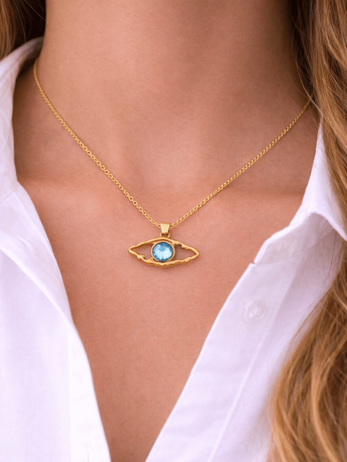 Ατσάλινο Κολιέ με Μάτι και Γαλάζιο Κρύσταλλο (Χρυσό)