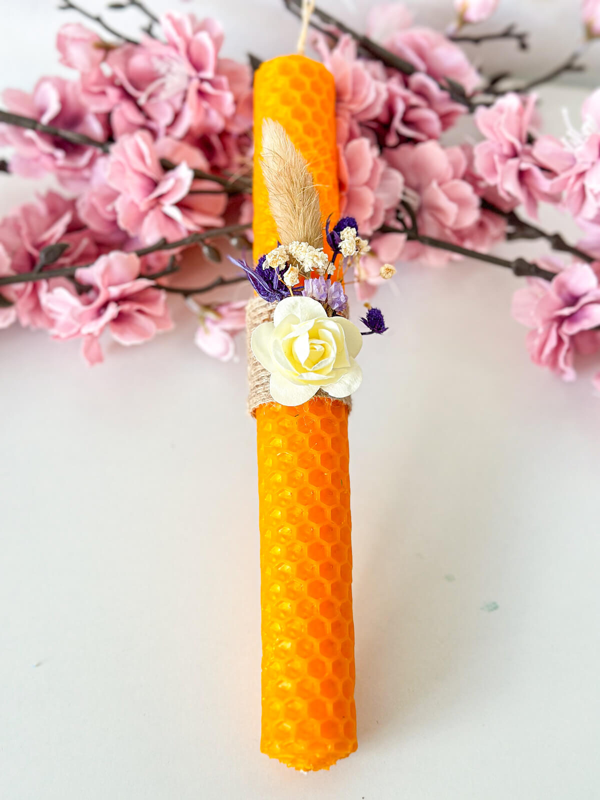 Χειροποίητη Αρωματική Λαμπάδα Μελισσοκέρι με Αποξηραμένα Λουλούδια (Πορτοκαλί)