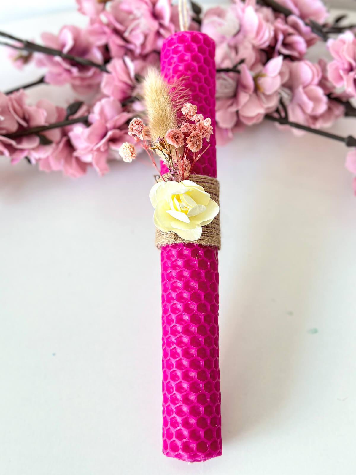 Χειροποίητη Αρωματική Λαμπάδα Μελισσοκέρι με Αποξηραμένα Λουλούδια (Φούξια – Λευκό)