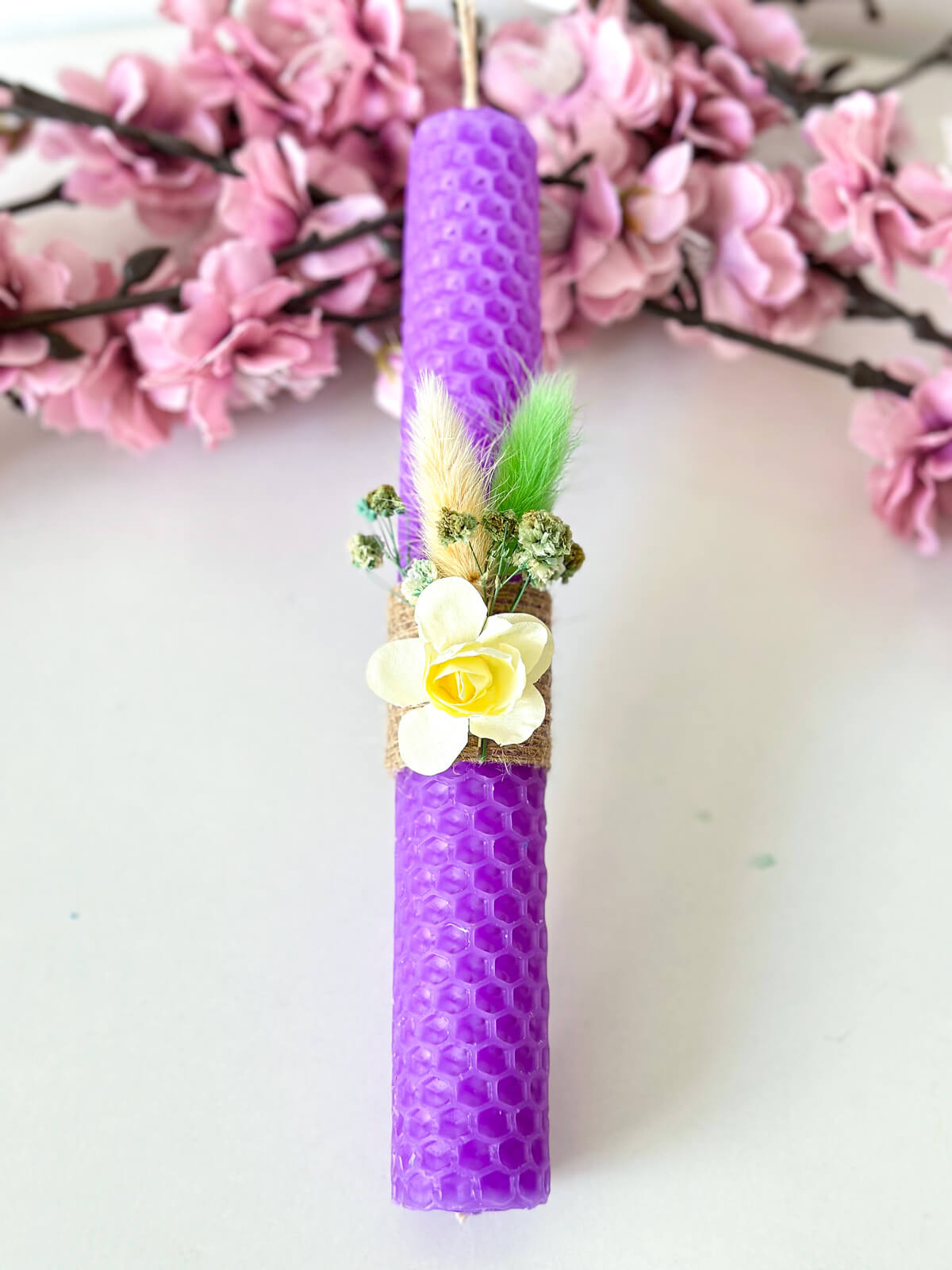 Χειροποίητη Αρωματική Λαμπάδα Μελισσοκέρι με Αποξηραμένα Λουλούδια (Μωβ)