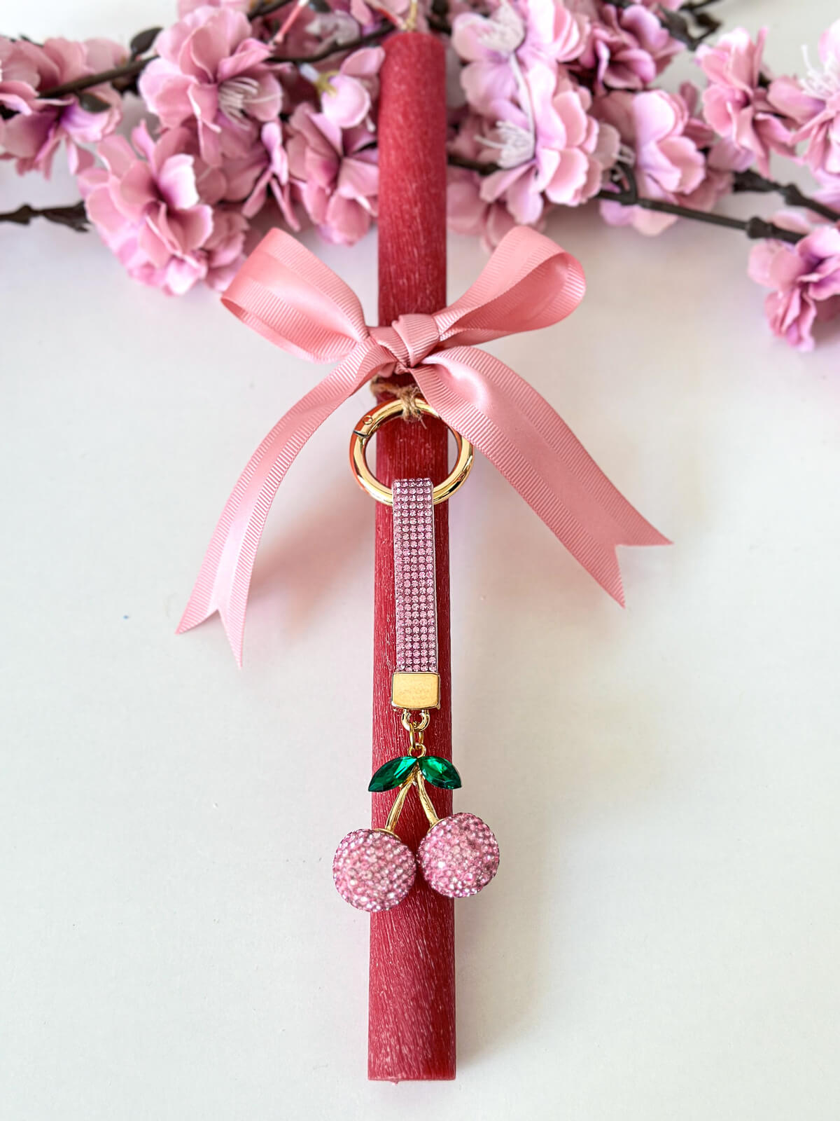 Χειροποίητη Αρωματική Λαμπάδα με Κυλινδρικό Κερί και Μπρελόκ Ροζ Κεράσακια